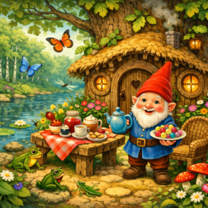 В одному лісі жив маленький, добрий і дуже гарний гномик. Його затишна хатинка з дуба стояла на березі річки, де жили його друзі — жабки, коники, жучки та яскраві, як квіти, різнобарвні метелики. У гномика було багато друзів, які часто приходили до нього в гості. Разом вони пили чай з варенням і ласували фруктовими цукерками, які гномик сам готував. Ось і сьогодні в його хатинці витав аромат цукерок та свіжої випічки. Все це він акуратно склав у плетеному кошичку — адже збирався в гості до Їжачка, у якого був день...