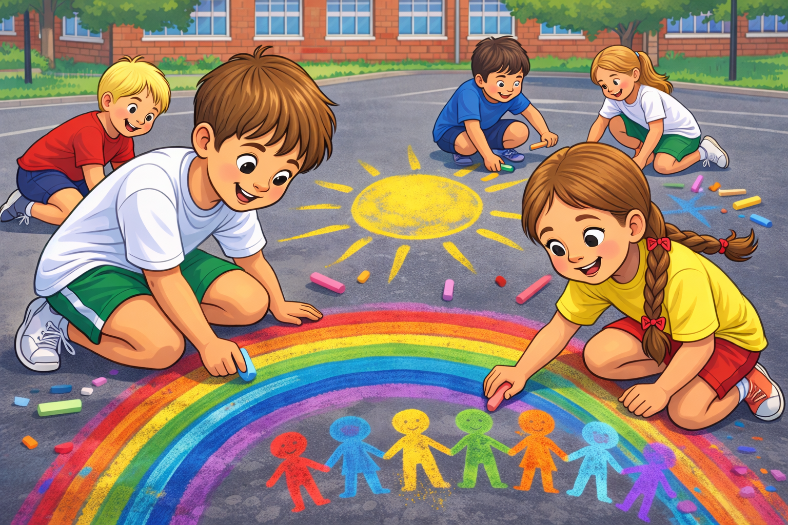 Олег з недовірою, але захоплений азартом нової подруги, беззаперечно погодився. Тож діти знайшли кольорові крейди та почали малювати на асфальті. Мія малювала величезне сонце, а Олег додав до нього смішні очі. Потім з’явилася веселка, а під нею дві фігурки з піднятими руками.